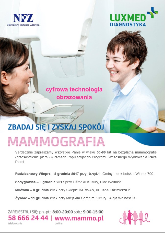 - lub otrzymały odpowiednie pisemne wskazanie ( rak piersi wśród członków rodziny, mutacje w genach BRCA 1 i BRCA 2 ) i nie miały wykonanej mammografii w ciągu ostatnich 12 miesięcy